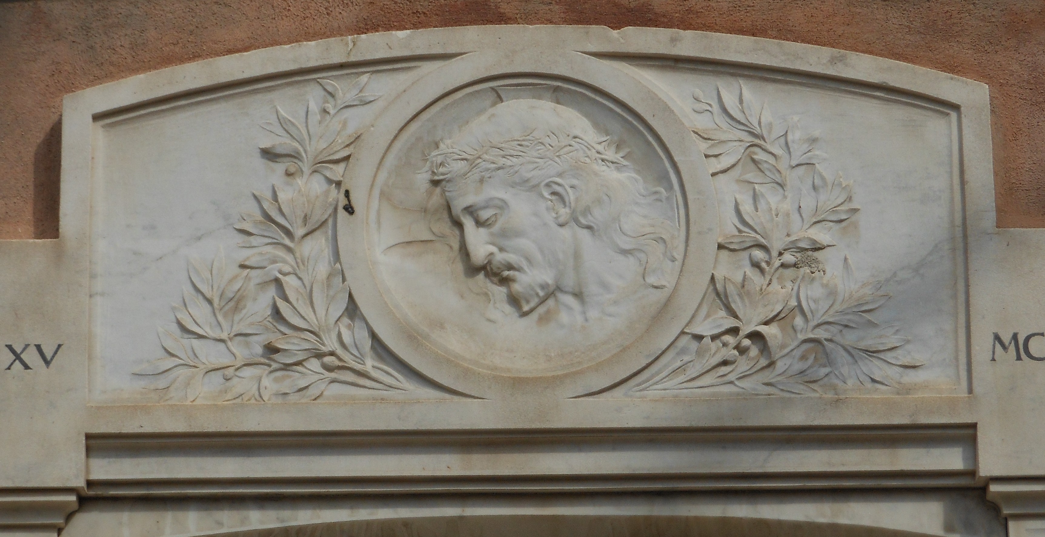 Lapide rettangolare con cornice modanata caratterizzata da due altorilievi, uno nella parte superiore in cui è rappresentato, tra rami di ulivo, un medaglione con all'interno il volto addolorato di Cristo con corona di spine mentre sotto è posto il rilievo principale con la Vittoria alata che premia un soldato. Nella parte inferiore della lapide sono riportati i nomi dei caduti della Prima Guerra Mondiale. Ai lati, la cornice esterna è decorata con viticci che sostengono due fiamme perpetue