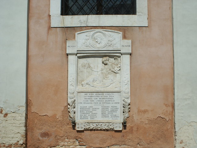 - NOTIZIE STORICO CRITICHE Nell'anno 1922 il Circolo giovanile cattolico "San Luca" fece domanda al Comune di Venezia di poter realizzare una lapide commemorativa ai caduti per la Parrocchia di San Luca e il 17 marzo 1922 la Giunta municipale concesse il contributo di Lire 200 per la realizzazione di questa. (Vedi Archivio Comunale Celestia, Venezia, posizione: 1921-1925, IX/4/9, fascicolo: 60050/4730)