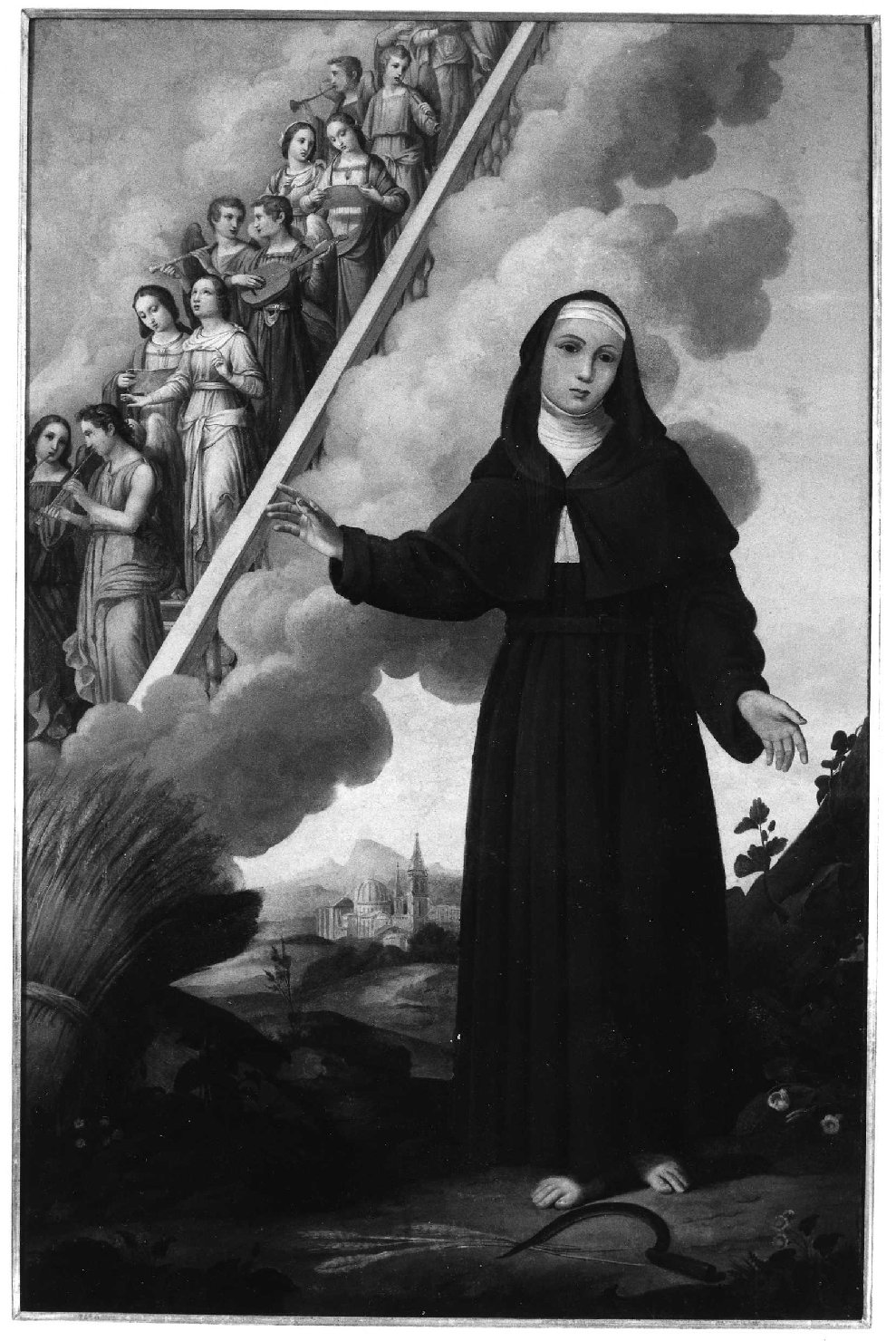 In primo piano Sant'Angela vestita da suora a piedi nudi e con le bracia allargate. Ai suoi piedi un falcetto e delle spighe; accanto un fascio di spighe. Asinistra un corteo di angeli musicanti in doppia fila scende da una scala fra le nuvole. Sullo sfondo un paesaggio con chiesa e campanile