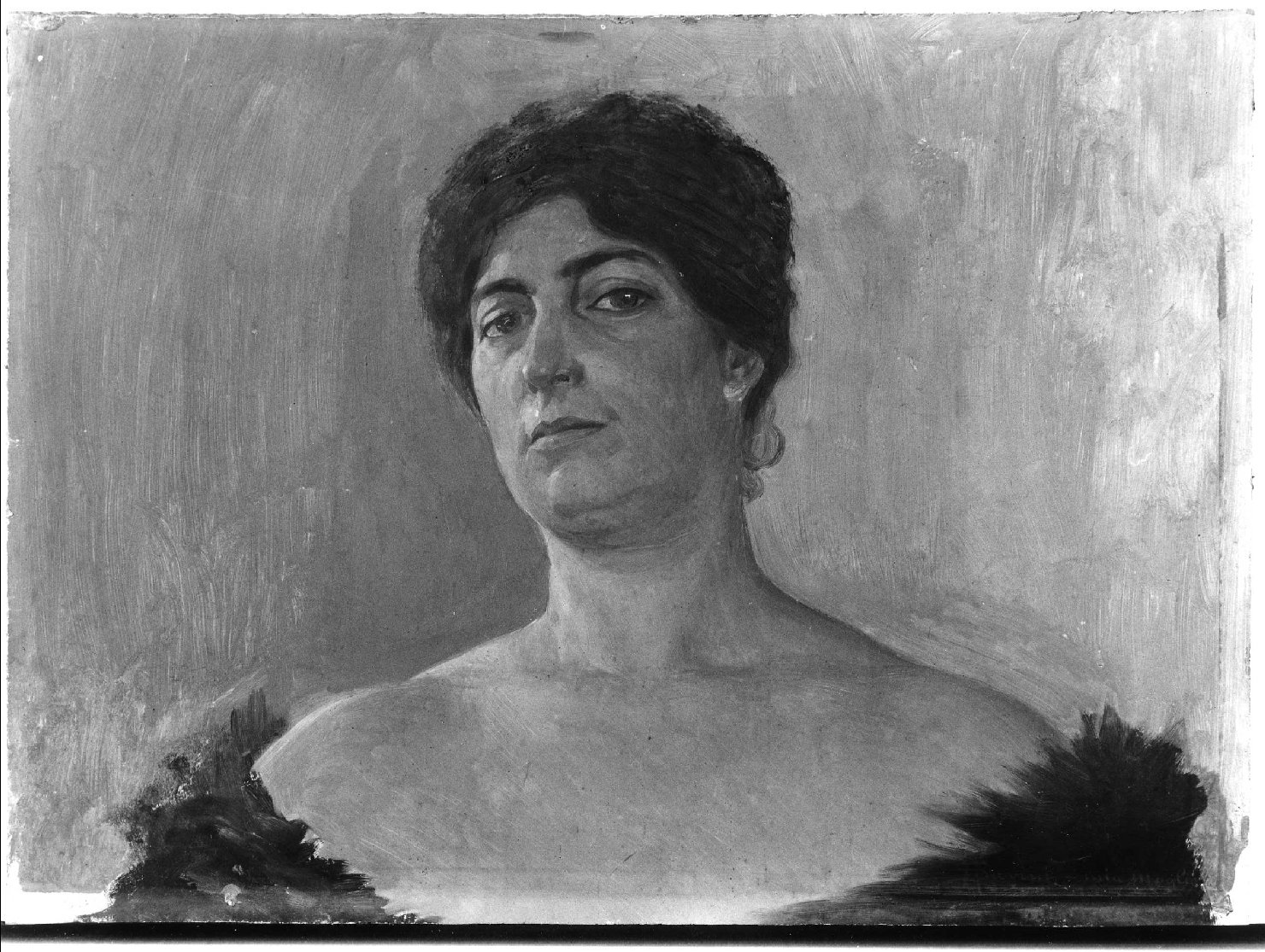 Ritratto frontale di donna con le spalle scoperte e un abito scuro