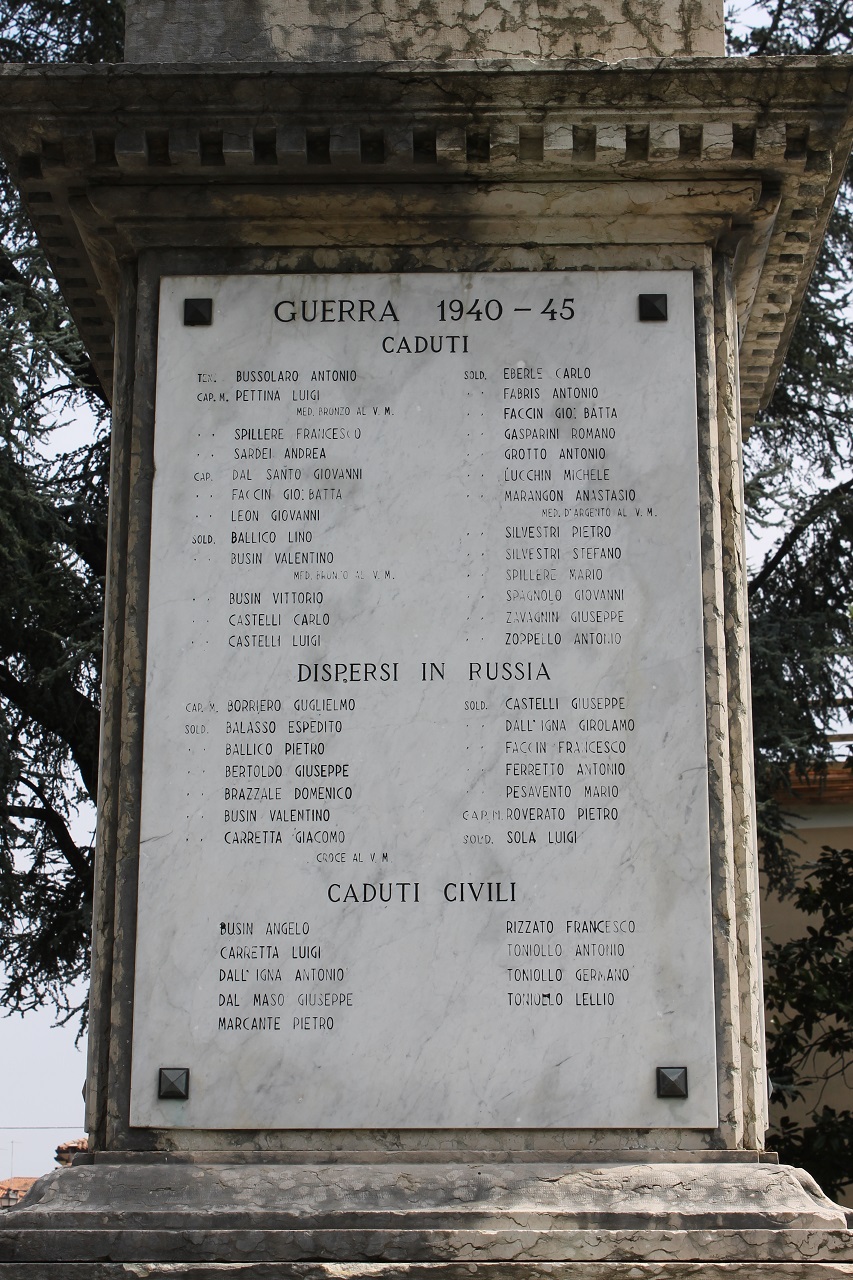 - NOTIZIE STORICO CRITICHE Al termine della guerra si costituì anche a Zanè un comitato per l'erezione di un monumento ai caduti della città e il denaro necessario alla costruzione venne raccolto grazie a offerte e lotterie. Fra i vari progetti presentati venne preferito quello della ditta dei fratelli Cavallini di Pove, di semplice eleganza. Ai primi di giugno 1923 iniziarono i lavori e il monumento fu inaugurato solennemente il 25 novembre 1923 (Monumento ai Caduti, in "La Provincia di Vicenza", 5 giugno 1923; Inaugurazione del Monumento ai Caduti, in "La Provincia di Vicenza", 25 novembre 1923; Il Monumento ai caduti di Zanè, in "La Provincia di Vicenza", 27 novembre 1923; F. Dal Corobbo, Il volto cambiato. Zanè oggi e ieri, Verona 1995, pp. 119-121, 150-151)