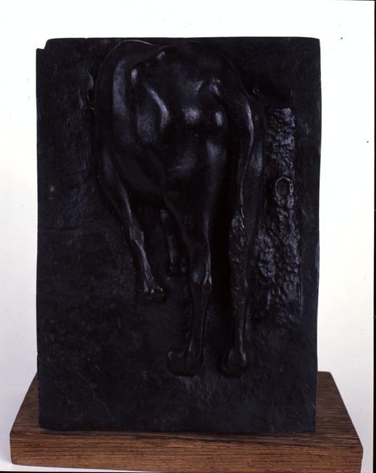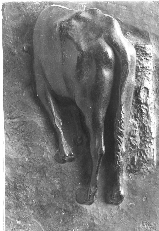 Bue colto da tergo leggermente girato sul fianco sinistro. Patina bruna, bassorilievo