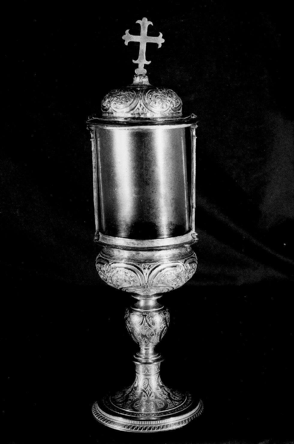 La base, circolare, ed il nodo a vaso, sono in bronzo decorati a motivi vegetali stilizzati; il sottoteca ed il cupolino, sormontato da crocetta apicale, sono in rame decorati a volute