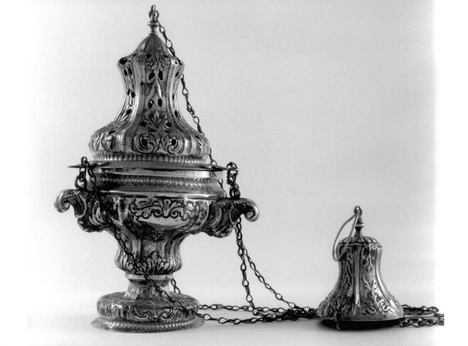 Base circolare . Coppa , coperchio e campana decorate con vo lute , foglie e palmette . Anello apicale