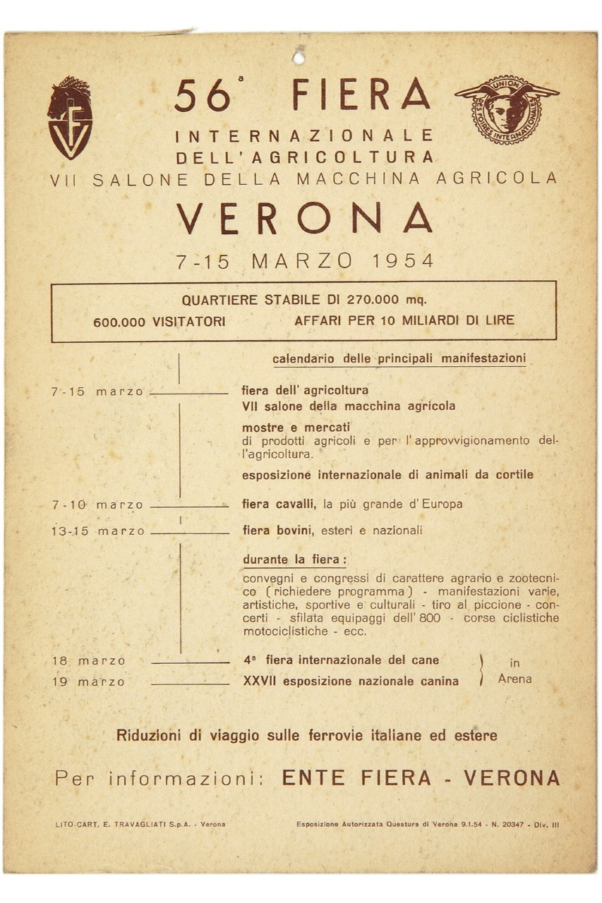 Lettura iconografica:campi; architetture; fattoria; fienile; figure maschili; contadini; macchina agricola; animali; equino; cavallo; imboccatura; coccarda tricolore; veduta di città; architetture. Categoria merceologica/ tipo evento: agricoltura; fiere; industria meccanica; macchine agricole; salone; enti di promozione turistica; trasporti; riduzioni ferroviarie; associazioni;manifestazioni; fiere. Nomi: Fiera Internazionale dell'Agricoltura; Salone della Macchina Agricola; Arena di Verona; ENIT; Ente Nazionale per l’incremento delle Industrie Turistiche; Union des Foires Internationales. Luoghi: Verona