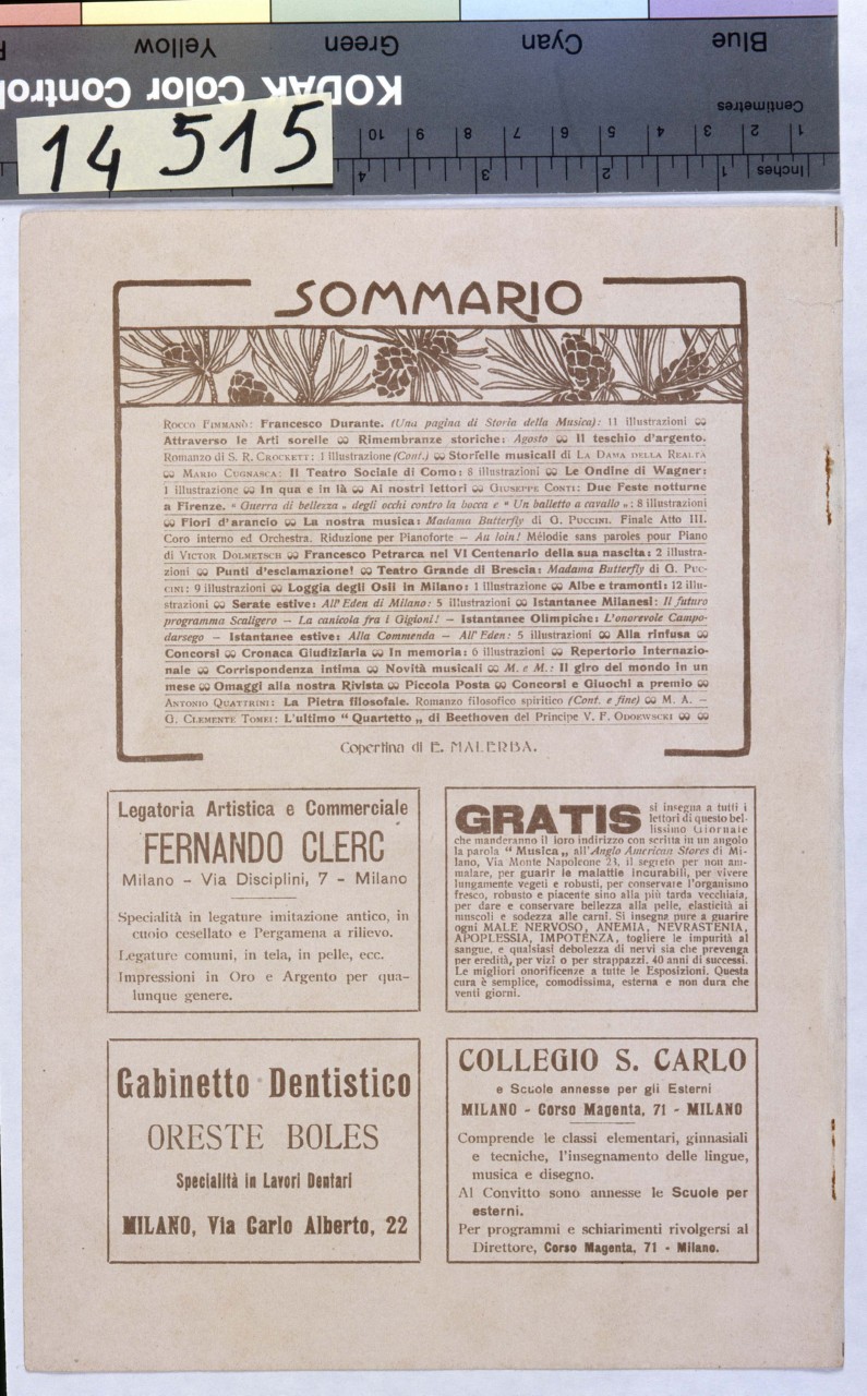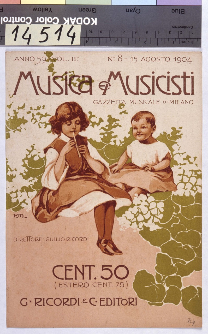 Lettura iconografica: figure femminili; bambine; flauto; musica. Categoria merceologica/ tipo evento: informazione e comunicazione; editoria; periodico mensile; cultura. Nomi: Musica e Musicisti; Giulio Ricordi. Luoghi: Milano