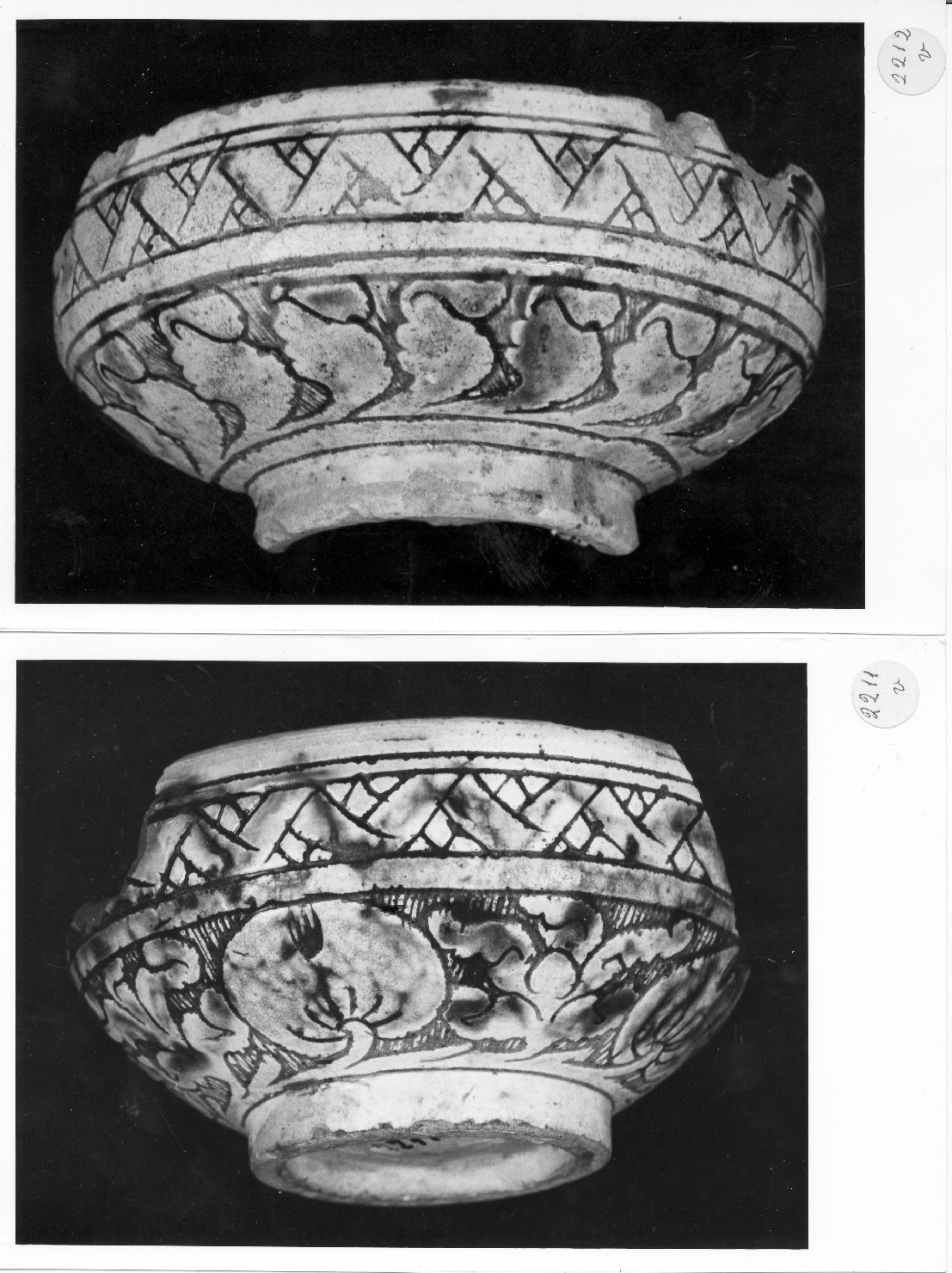 Mezza tazza, metà del fondo e del corpo fino al bordo. Decorazione del bordo interno con fascia a nastro del rovescio. Nel cavo, su fondo puntinato verde con rosette viola sono rappresentati resti di una coppia di figure maschile e femminile riconoscibili dai copricapi