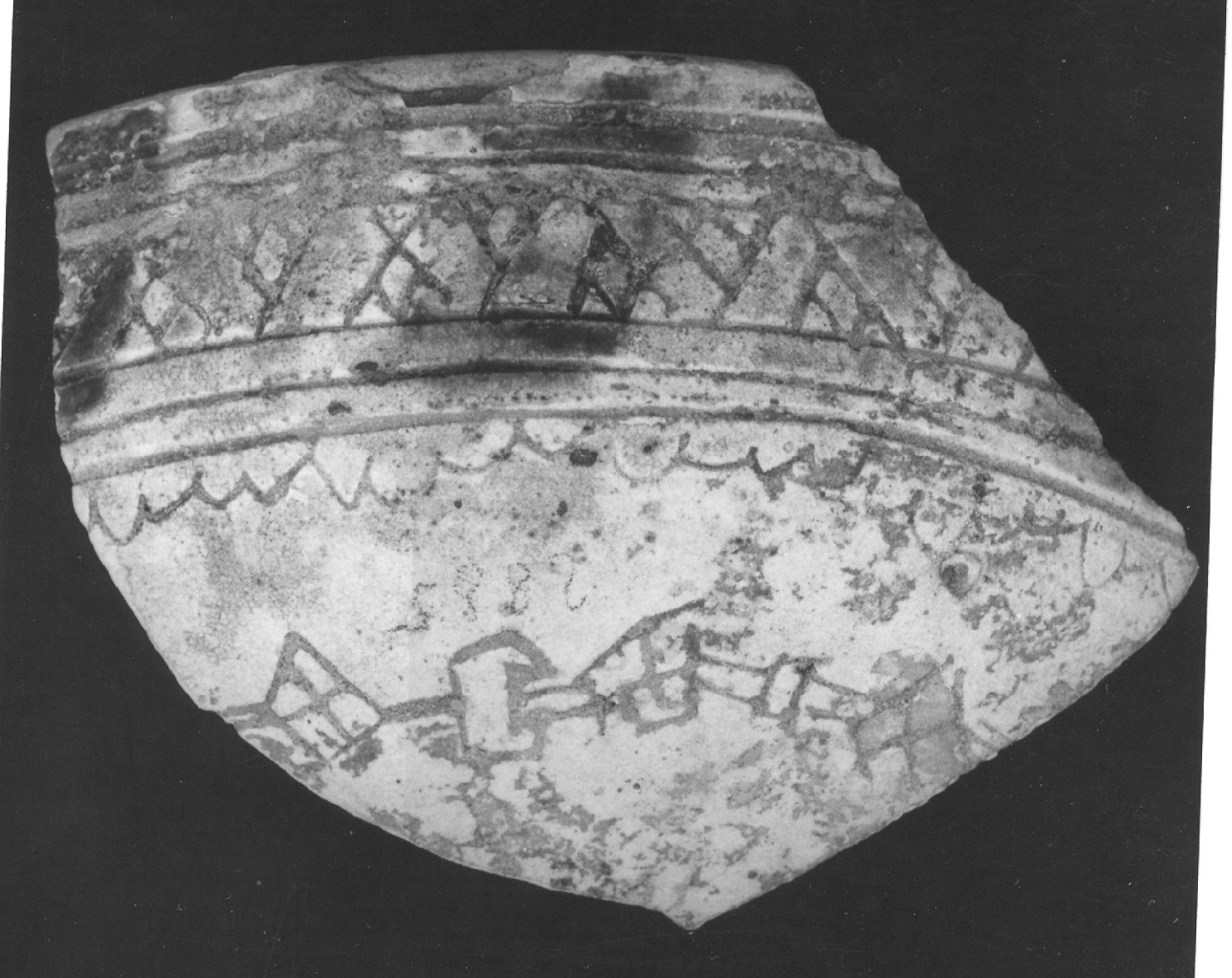 Frammento di corpo con bordo di ciotola; decorazione anche all' esterno. All' interno decorazione a stecca con tratti di giallo e verdesulle righe trasversali