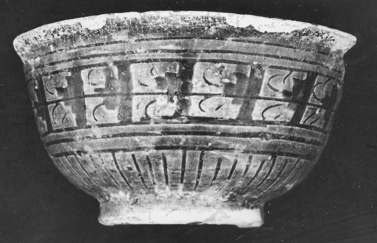 Mezza ciotola dal fondo all' orlo. Decorazione verde e nera all' esterno e all' interno