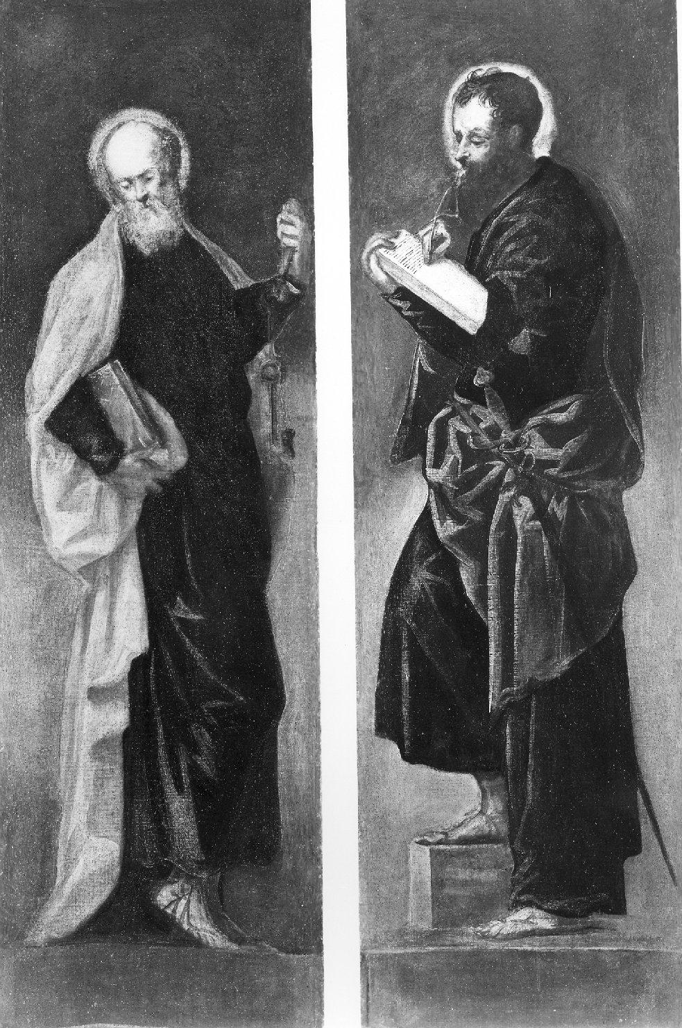 - NOTIZIE STORICO CRITICHE Con il "San Paolo" (inv. n. 501)ritenuti un tempo di bottega di Tintoretto ,furono attribuiti a quest'ultimo nel catalogo del 1928 e nei successivi . Pallucchini (1950) li ritiene contemporanei alle Adultere del Rijksmuseu m di Amsterdam e della Galleria Nazionale di Roma, con cui condividono le figure allungate e attorte, di stilizzata eleganza, che non sarà priva di echi nella produzione del Greco. Sono databili nella seconda metà degli an ni quaranta. Recentemente Echols (1993) propone di assegnarli a Giovanni G alizzi, ma l'attribuzione non sembra sostenibile, considerata la qualità d elle due opere