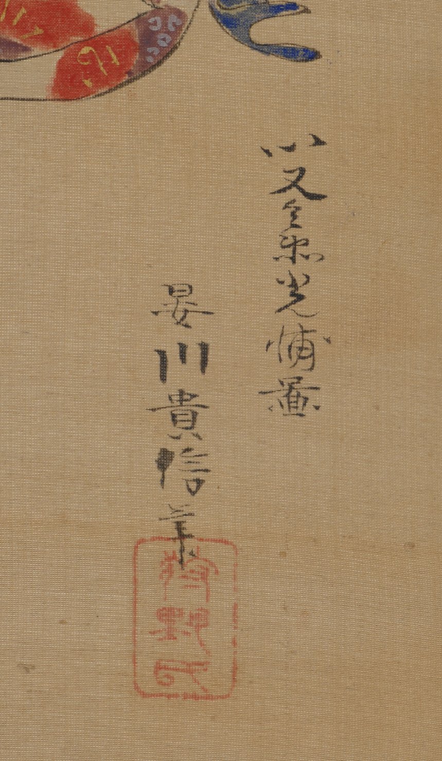 - ISCRIZIONI a destra in basso - ??? Ansen Takanobu hitsu (traduzione: ??? dipinto da Ansen Takanobu - Kanô Takanobu (autore dell'opera) - corsivo - a matita -