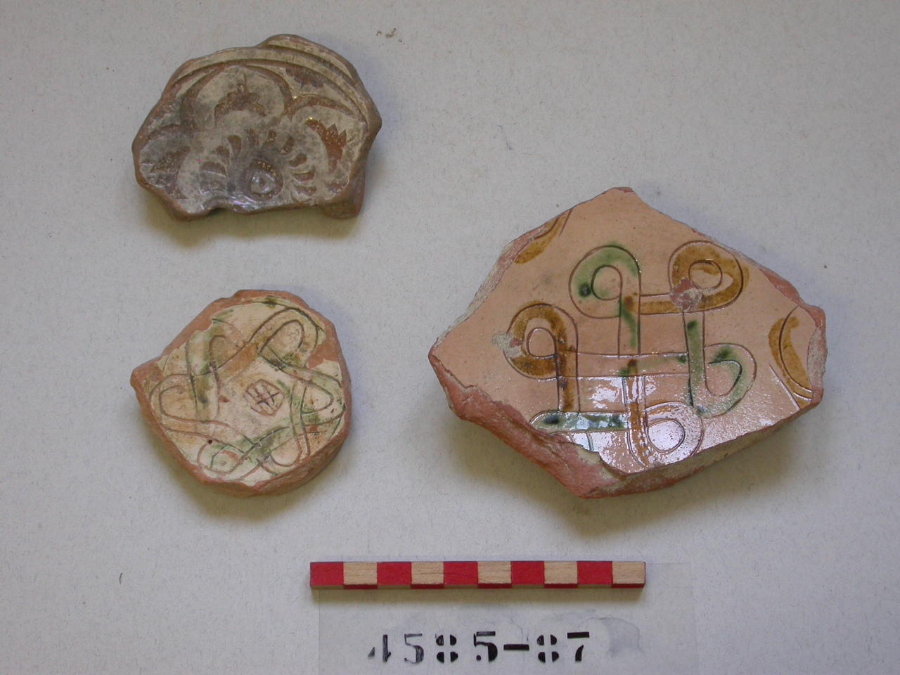 Fondo con piede ad anello pertinente a forma aperta; corpo ceramico rosso. L'esterno presenta diffuse incrostazioni, l'interno è ingobbiato, graffito a punta, dipinto in ferraccia e ramina e invetriato (vetrina brillante). Il decoro consiste in un elaborato nodo gordiano con elementi stilizzati di contorno