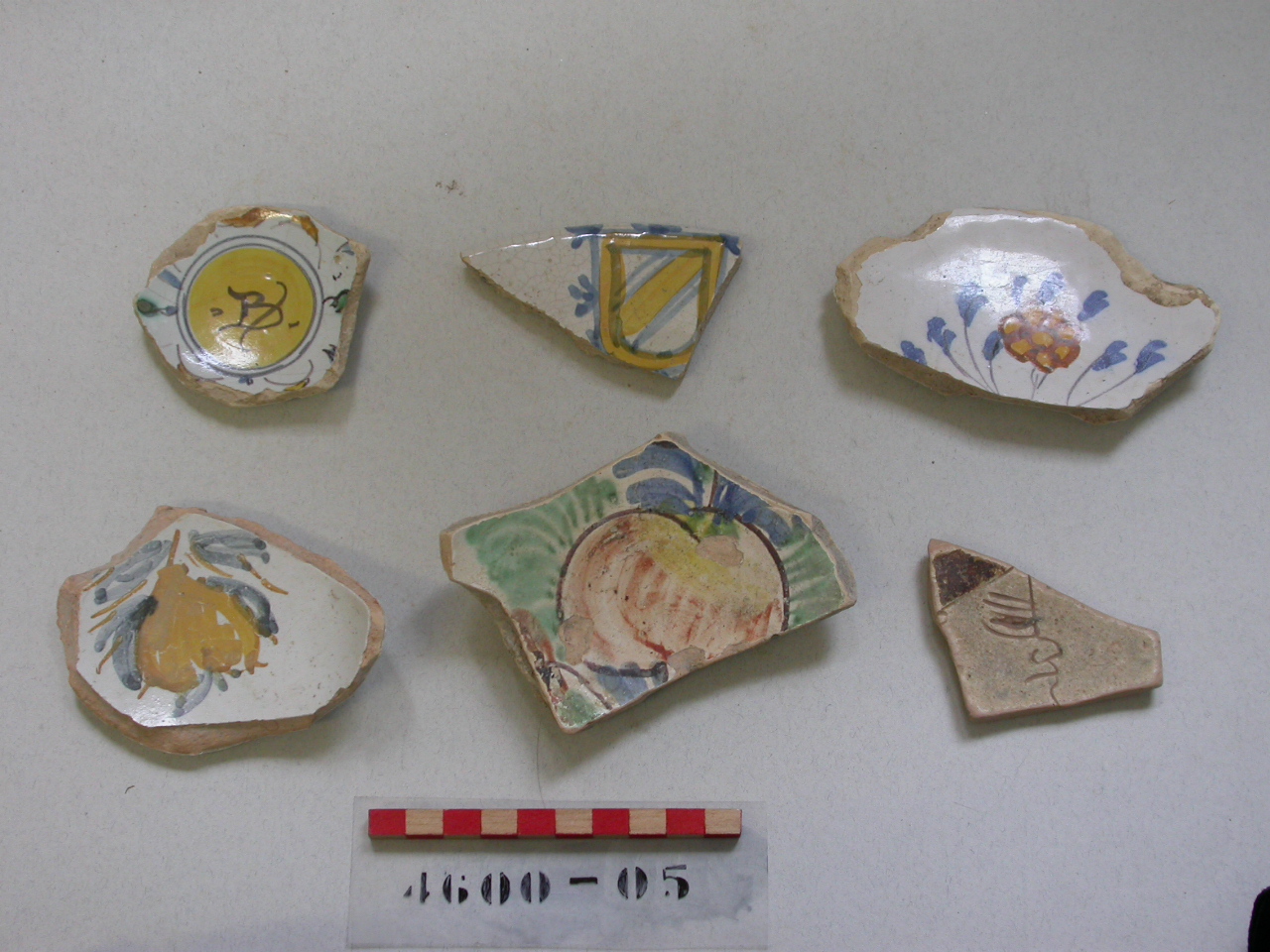 Frammento di fondo di scodella con corpo ceramico beige. La superficie esterna è completamente rivestita da smalto bianco, quella interna è smaltata in bianco e dipinta in policromia (giallo, azzurro, arancio, verde): entro medaglione campito in giallo e dipinta la lettera B, attorno al medaglione vi sono elemenenti vegetali stilizzati