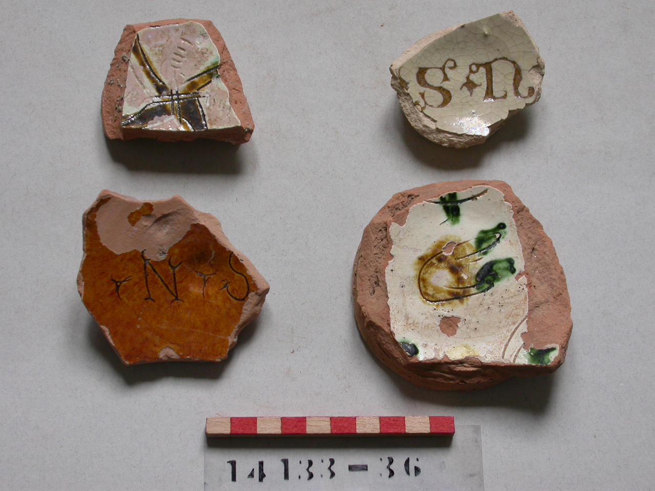 Fondo di scodella con piede ad anello; corpo ceramico ocra, calcareo. Ingobbiata, graffita a punta larga (iniziali gotiche S.N.) e invetriata; esterno rivestito fino al piede compreso