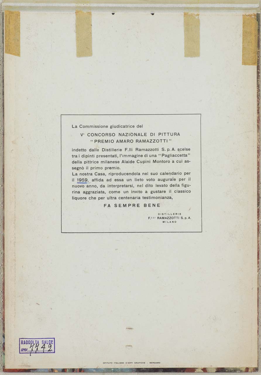 Lettura iconografica: figura femminile; cappello da pagliaccio; trombetta. Categoria merceologica/ tipo evento: industria alimentare; bevande; liquori; amari. Nomi: Ramazzotti. Luoghi: Milano