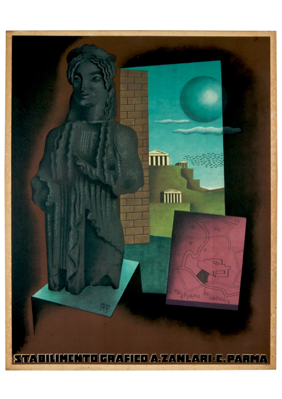 Stabilimento Grafico A. Zanlari & C. statua e pianta urbana in una stanza con templi di Atene sullo sfondo