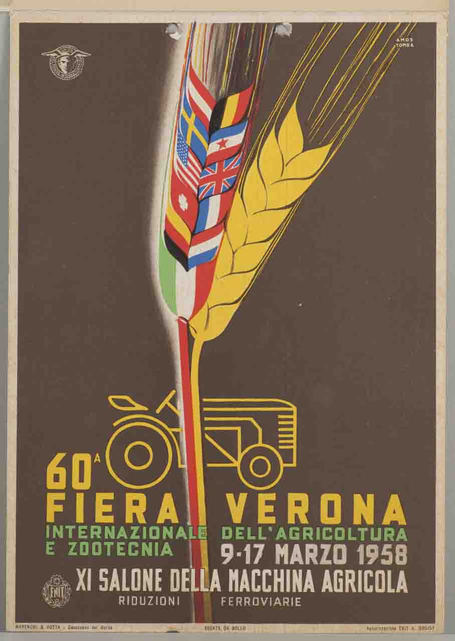 Lettura iconografica: spighe; grano; bandiere; trattore. Categoria merceologica/ tipo evento: agricoltura; fiera; organizzazioni associative; turismo; associazioni di promozione turistica; enti di promozione turistica; trasporti; riduzioni ferroviarie. Nomi: Sessantesima Fiera Verona; Fiera internazionale dell'agricoltura e zootecnia; Salone della macchina agricola; UFI; Union des Foires Internationales; ENIT; Ente Nazionale per l'incremento delle Industrie Turistiche. Luoghi: Italia; Paesi Bassi; Germania; Francia; Svizzera; Gran Bretagna; Stati Uniti d'America; Jugoslavia; Svezia; Belgio; Austria; Verona