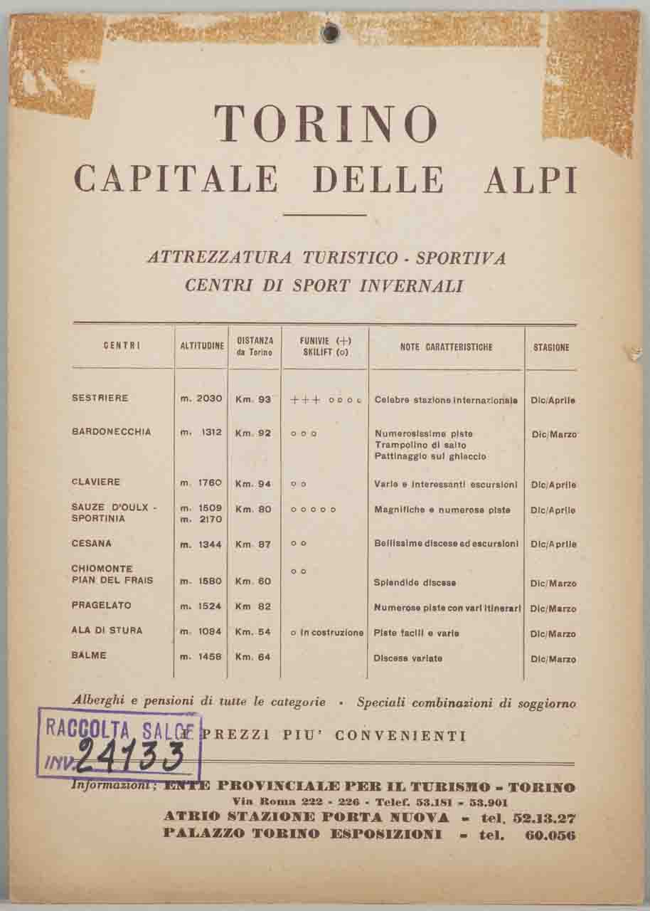 Lettura iconografica: sole; montagna; cabinovia; alberi; pini; abeti; ramo innevato. Categoria merceologica/ tipo evento: turismo; montagna; enti di promozione turistica; sport; sci; impianti sportivi; pista da sci; impianto di risalita. Nomi: Torino; ENIT; Ente Nazionale per l’incremento delle Industrie Turistiche; Ente Provinciale Turismo