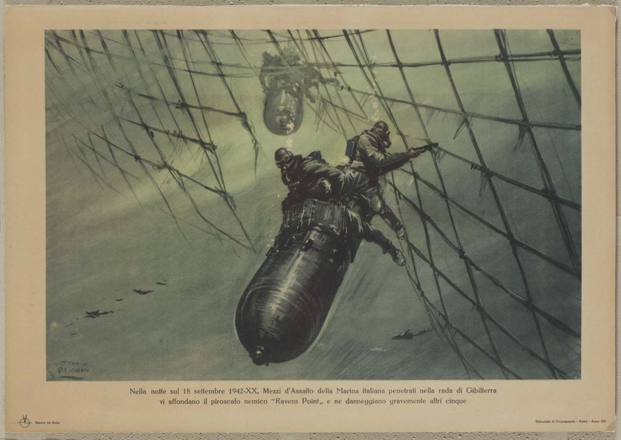 Lettura iconografica: mare; soldati sommozzatori; rete; siluri. Categoria merceologica/ tipo evento: guerra; seconda guerra mondiale; impresa eroica; mezzi d'assalto; informazione e comunicazione; editoria; periodico; propaganda bellica. Nomi: Marina italiana; Ravens Point; La Vittoria. Luoghi: Regno Unito; Gibilterra