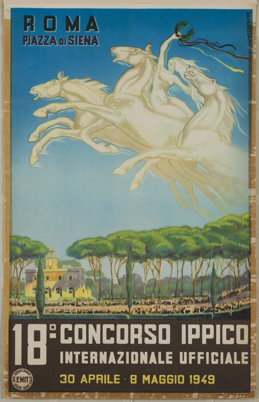 Lettura iconografica: figura femminile; cavalli; alloro; villa; parco; alberi; folla; spalti; sole. Categoria merceologica/ tipo evento: sport; manifestazioni sportive; concorso; equitazione; tempo libero; turismo; enti di promozione turistica. Nomi: Concorso Ippico Internazionale; Villa Borghese; famiglia Borghese; Marcantonio IV Borghese; E.N.I.T.; Ente Nazionale Industrie Turistiche. Luoghi: Roma; Piazza di Siena; Siena