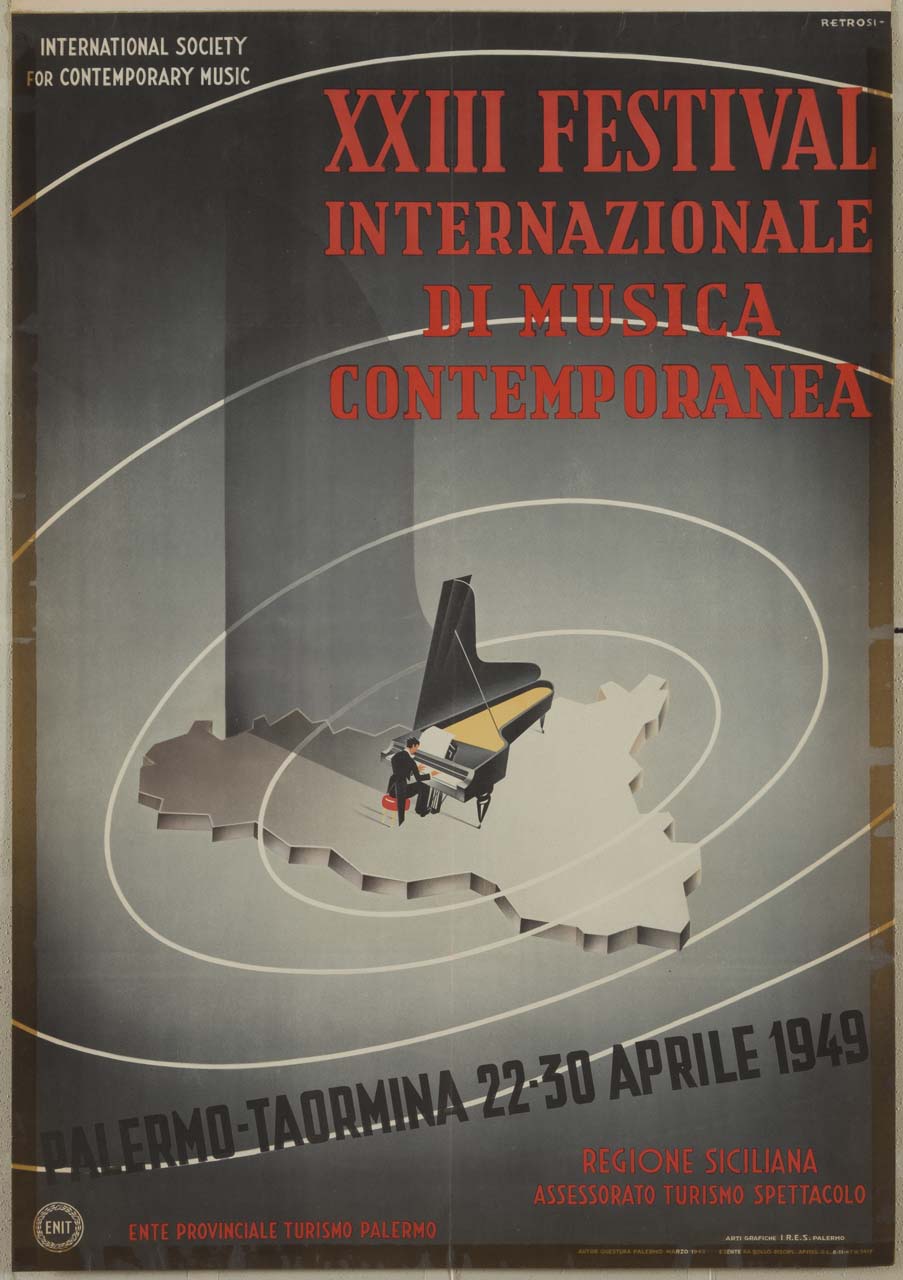 Lettura iconografica: figura maschile; strumento musicale; spartito; onde sonore;regione italiana. Categoria merceologica/ tipo evento: manifestazioni culturali; festival; festival musicale; spettacolo; teatro; musica; concerto; strumenti musicali; tempo libero; turismo; enti di promozione turistica. Nomi: XXIII Festival Internazionale di musica contemporanea; International Society for Contemporary Music; Ente Provinciale Turismo Palermo; Regione Siciliana Assessorato Turismo Spettacolo; Ente Nazionale Industrie Turistiche. Luoghi: Sicilia; Palermo; Taormina