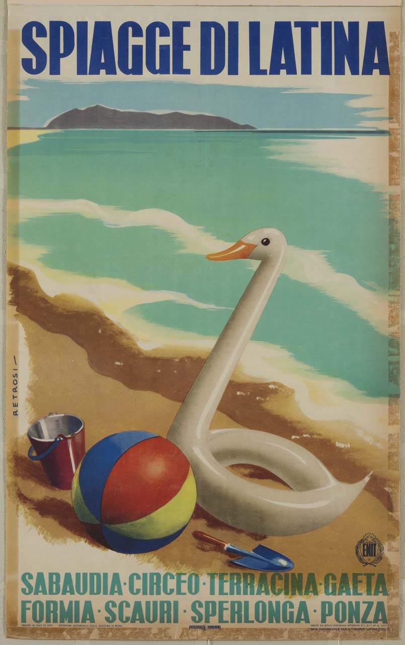 Lettura iconografica: mare; spiaggia; sole; onde; salvagente; secchiello; paletta. Categoria merceologica/ tipo evento: tempo libero; turismo; mare; enti di promozione turistica. Nomi: Ente Nazionale Industrie Turistiche. Luoghi: Latina; Sabaudia; Circeo; Terracina; Gaeta; Formia; Scauri; Sperlonga; Ponza