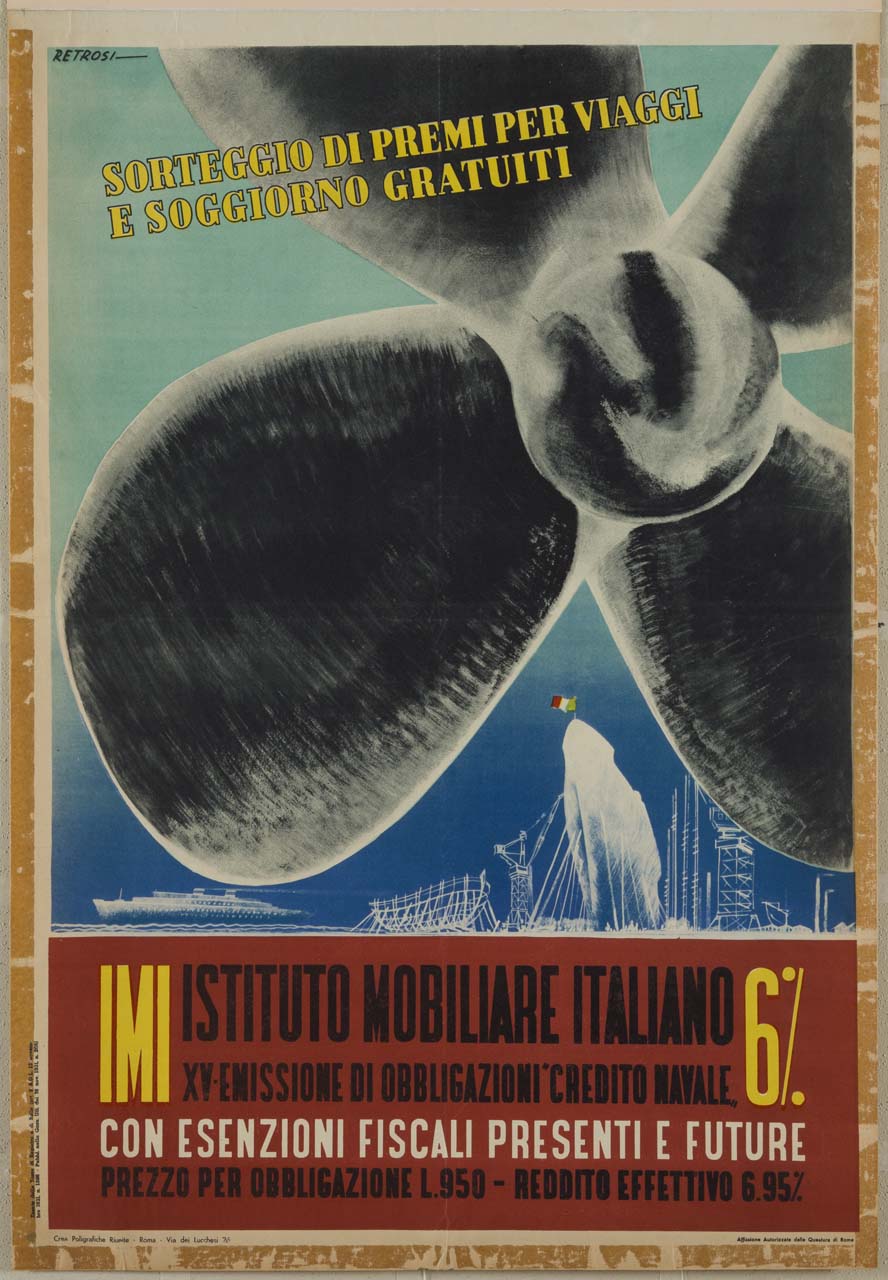 Lettura iconografica: cantiere navale; navi; elica; bandiera italiana. Categoria merceologica/ tipo evento: attività finanziarie e assicurative; banche; emissione di obbligazioni. Nomi: Istituto Mobiliare Italiano; emissioni di obbligazioni credito navale; Teodoro Mayer; Alberto Beneduce; Felice Guarneri. Luoghi: Roma