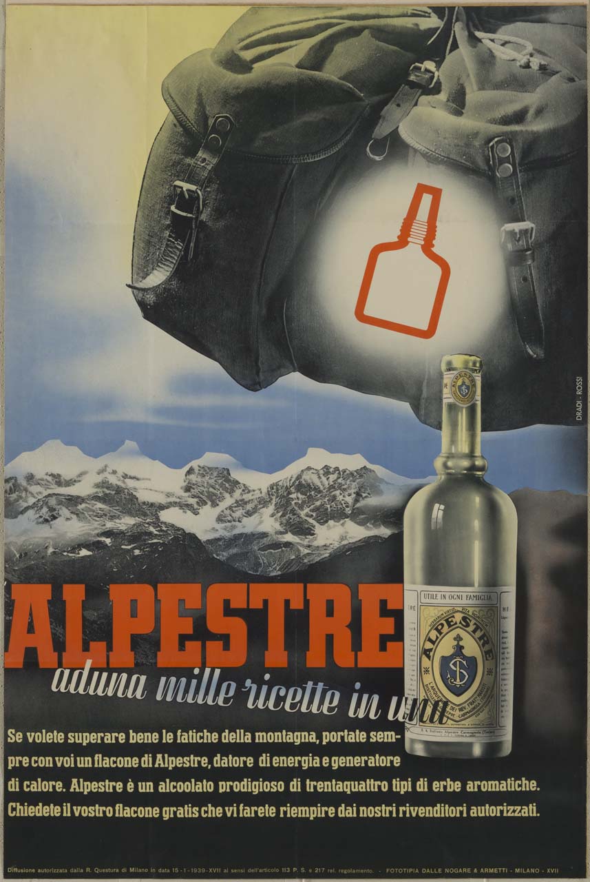 Lettura iconografica: paesaggio montano; zaino; bottiglia. Categoria merceologica/ tipo evento: industria alimentare; bevande; liquori; amaro. Nomi: Alpestre; Frati Maristi. Luoghi: Torino; Carmagnola; Francia; Saint-Chamond
