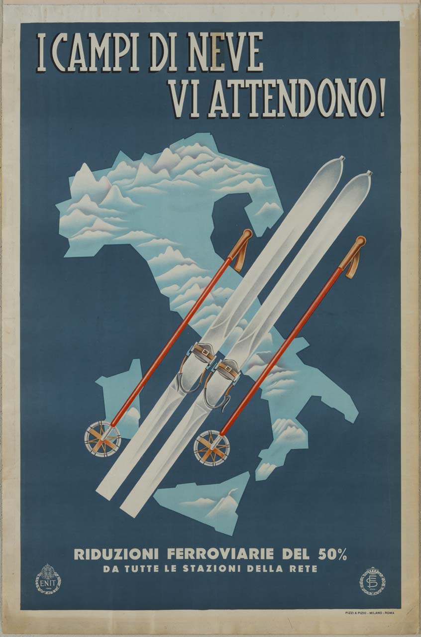 Lettura iconografica: nazioni; catene montuose; neve; sport; sci; racchette da sci. Categoria merceologica/ tipo evento: tempo libero; turismo di montagna; enti di promozione turistica; trasporti; compagnia ferroviaria; riduzioni ferroviarie. Nomi: ENIT; Ente nazionale per l'Incremento delle Industrie Turistiche; FS; Ferrovie dello Stato; Alpi; Appennini. Luoghi: Italia