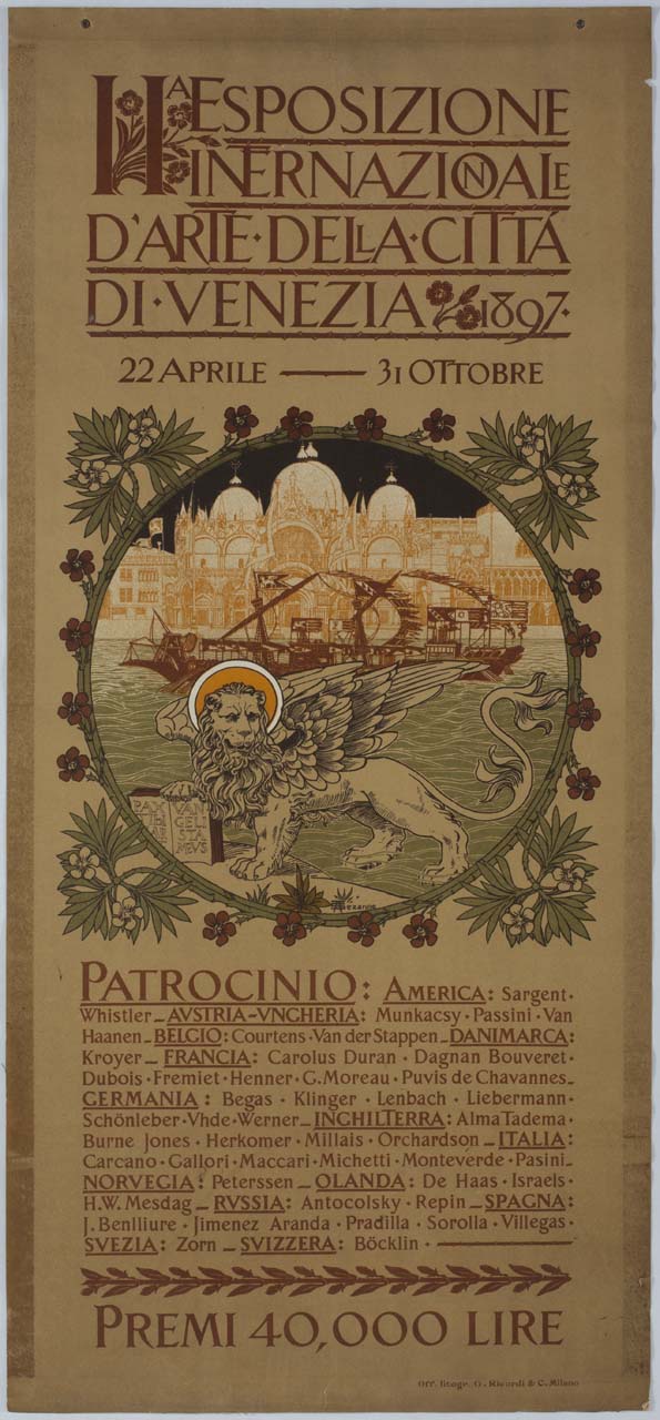 Lettura iconografica: veduta di città; veduta di Venezia; architetture; imbarcazione; leone di San Marco. Categoria merceologica/ tipo evento: manifestazioni culturali; esposizioni; esposizione d'arte; concorsi. Nomi: II Esposizione Internazionale d'arte della città di Venezia; John Singer Sargent; James Abbott MacNeill Whistler; Mihály Munkacsy; Ludwig Johann Passini; Cecil Van Haanen; Frans Courtens; Charles Van der Stappen; Peter Severin Kroyer; Charles Émile Auguste Durand; Carolus Duran; Pascal Dagnan Bouveret; Paul Dubois; Emmanuel Fremiet; Jean-Jacques Henner; Gustave Moreau; Pierre Puvis de Chavannes; Reinhold Begas; Max Klinger; Franz Seraph von Lenbach; Max Liebermann; Gustav Schönleber; Fritz von Uhde; Anton von Werner; Lawrence Alma Tadema; Edward Coley Burne Jones; Hubert von Herkomer; John Everett Millais; William Quiller Orchardson; Filippo Carcano; Emilio Gallori; Cesare Maccari; Francesco Paolo Michetti; Giulio Monteverde; Alberto Pasini; Eilif Peterssen; Willem De Haas; Jozef Israels; Hendrik Willem Mesdag; Marc Matveyevich Antocolsky; Il'ja Efimovič Repin; José Benlliure; José Jimenez Aranda; Francisco Pradilla Ortiz; Joaquín Sorolla; José Villegas Cordero; Anders Leonard Zorn; Arnold Böcklin; Piazza San Marco. Luoghi: Italia; Venezia; America; Austria; Ungheria; Belgio; Danimarca; Francia; Germania; Inghilterra; Norvegia; Olanda; Russia; Spagna; Svezia; Svizzera