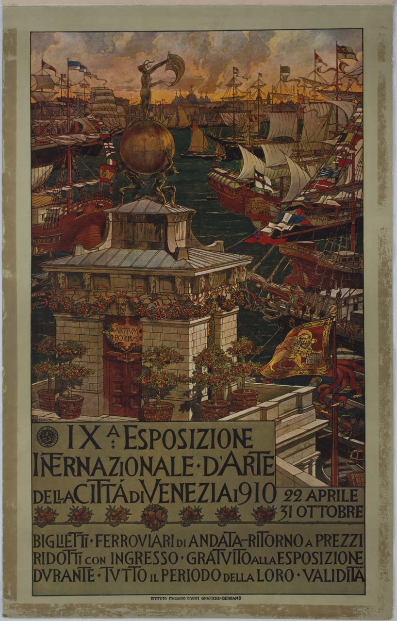 Lettura iconografica: paesaggio marino; veduta di città; veduta di Venezia; architetture; navi; festoni; nastri; vasi; fiori; bandiera della Repubblica di Venezia; bandiere internazionali. Categoria merceologica/ tipo evento: manifestazioni culturali; esposizioni; esposizione d'arte; riduzioni ferroviarie. Nomi: IX Esposizione Internazionale d'arte della città di Venezia. Luoghi: Venezia