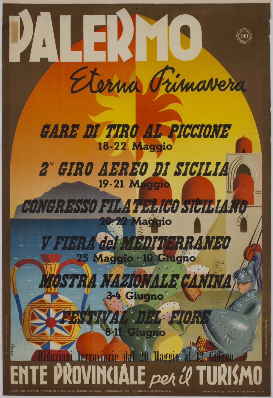 Lettura iconografica: anfora biansata; agrumi; arancia; limone; pera; fico d'India; marionetta; pupo siciliano; paladino; paesaggio marino; Monte Pellegrino; architetture; chiesa di San Giovanni degli Eremiti; sole. Categoria merceologica/ tipo evento: turismo; enti di promozione turistica; sport; gare; tiro al piccione; manifestazioni sportive; giro aereo; tempo libero; esposizioni ricreative; congressi; commercio; industria; artigianato; agricoltura; fiere; riduzioni ferroviarie. Nomi: 2 Giro Aereo di Sicilia; Congresso Filatelico Siciliano; V Fiera del Mediterraneo; Mostra Nazionale Canina; Festival del Fiore; Ente Provinciale per il Turismo; ENIT; Ente Nazionale per l'incremento delle Industrie Turistiche. Luoghi: Palermo