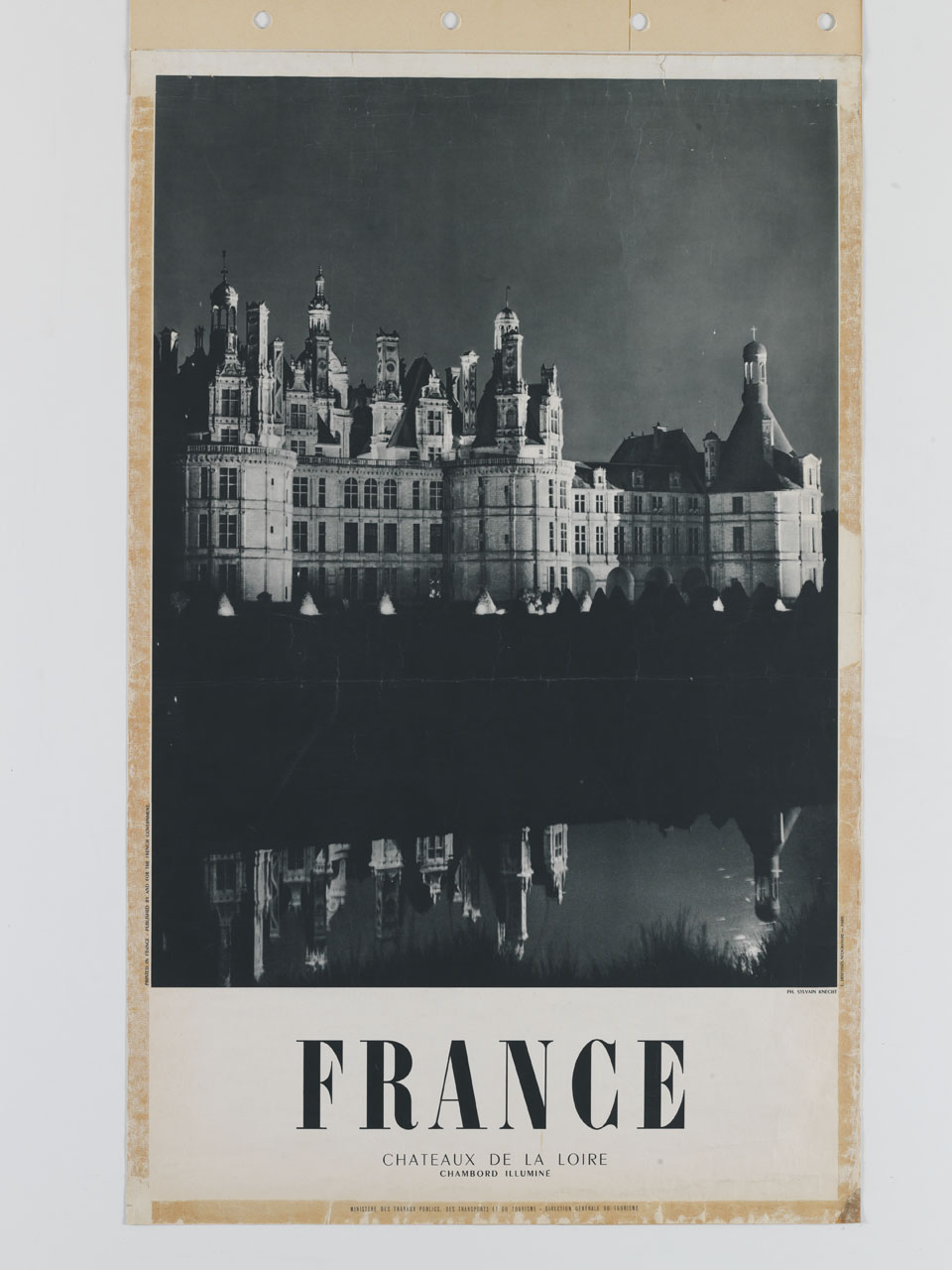 Lettura iconografica: riproduzione fotografica; veduta; architettura; castello di Chambord. Categoria merceologica/ tipo evento: turismo; enti di promozione turistica; amministrazione pubblica; amministrazione centrale; Ministero dei Lavori Pubblici, dei Trasporti e del Turismo; Ministère des Travaux Publics des Transports et du Tourisme. Nomi: Commissariat Général au Tourisme; Chateaux de la Loire. Luoghi: France; Francia; Chambord