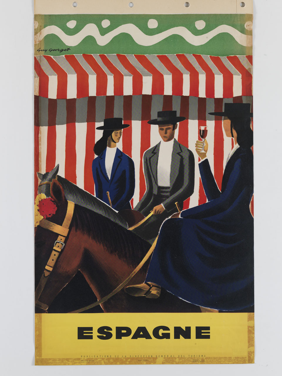 Lettura iconografica: figure femminili; figura maschile; cavalli; tenda; bicchieri; vino. Categoria merceologica/ tipo evento: turismo; enti di promozione turistica. Nomi: Direccion General del Turismo; DGT. Luoghi: Espagne; Spagna; Madrid