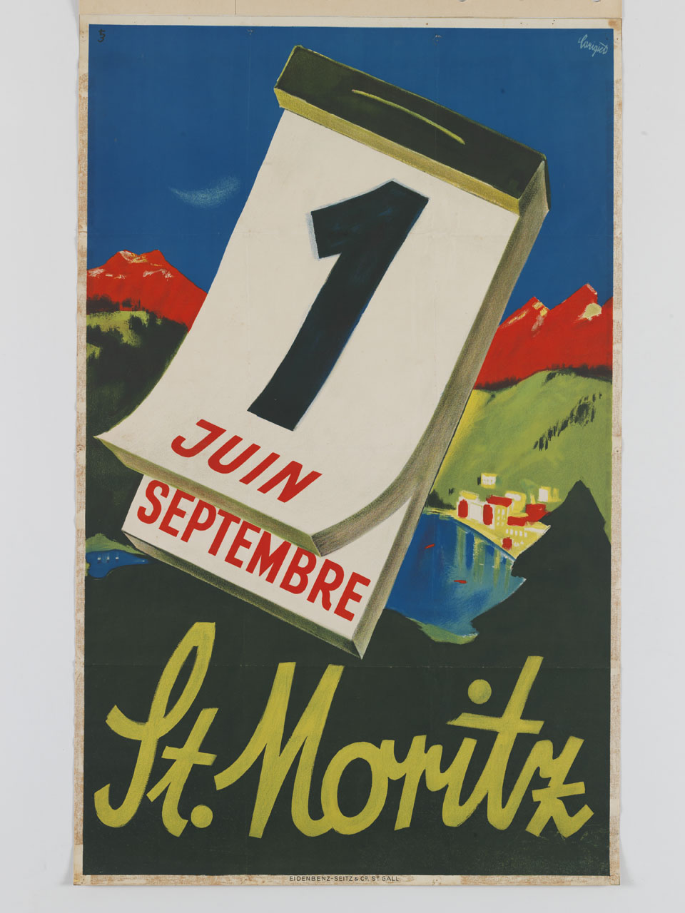 Lettura iconografica: calendario; montagne; lago; paese. Categoria merceologica/ tipo evento: turismo; montagna. Nomi: St. Moritz. Luoghi: Svizzera; Canton Grigioni