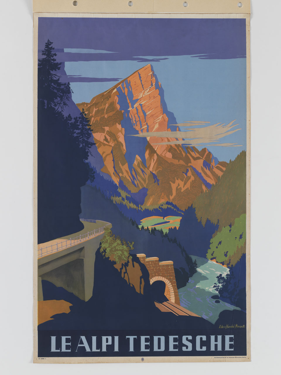 Lettura iconografica: veduta; montagna; strada; viadotto; ferrovia; torrente. Categoria merceologica/ tipo evento: turismo; montagna; enti di promozione turistica; agenzie di viaggio. Nomi: Alpi tedesche; Grossglockner; RDV; Reichsbahnzentrale für den Deutschen Reiseverkehr. Luoghi: Austria