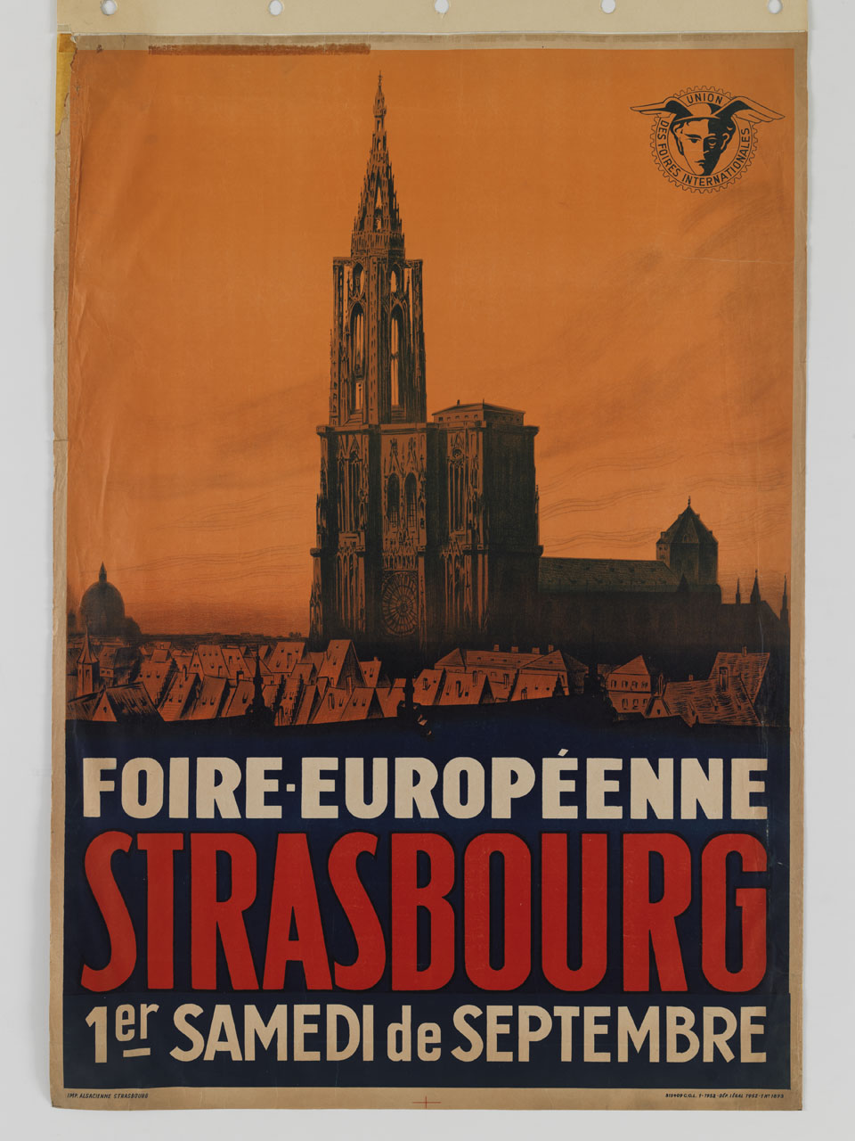 Lettura iconografica: veduta di Strasburgo; cattedrale di Notre Dame; tetti. Categoria merceologica/ tipo evento: commercio; industria; artigianato; agricoltura; fiere; associazioni economiche. Nomi: Foire Européenne; Union des Foires Internationales. Luoghi: Francia; Strasbourg; Strasburgo