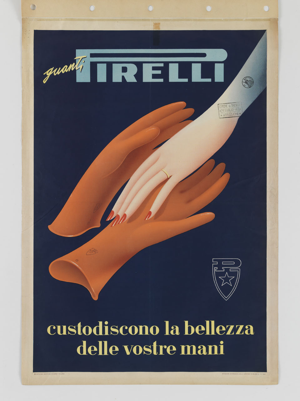 Lettura iconografica: mano femminile; fede; unghie smaltate; guanti in gomma. Categoria merceologica/ tipo evento: industria della gomma; guanti in gomma. Nomi: Pirelli. Luoghi: Milano
