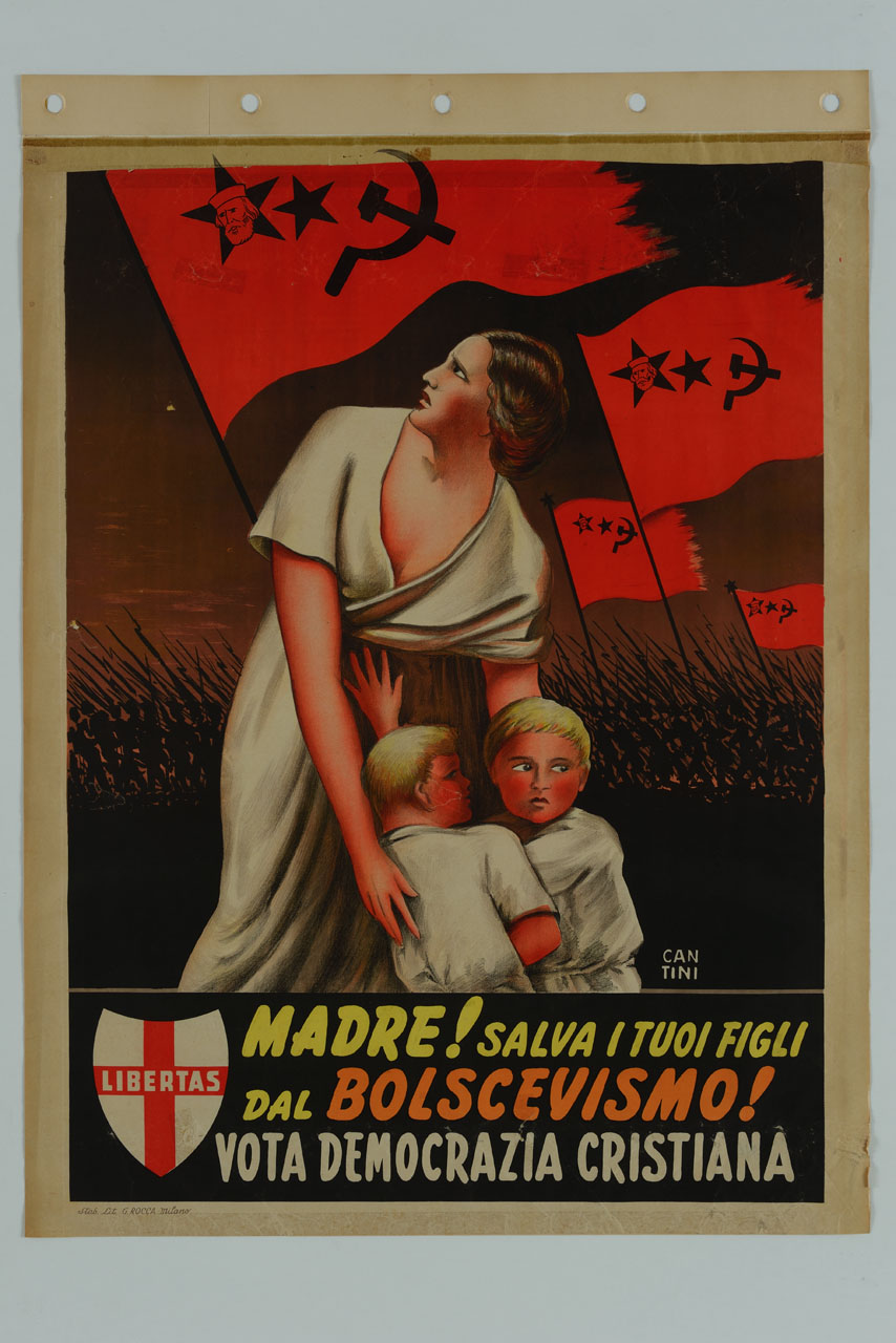 Lettura iconografica: figura femminile; madre; bambini; combattenti; bandiere del Partito Comunista Italiano. Categoria merceologica/ tipo evento: informazione e comunicazione; propaganda politica; propaganda anticomunista; politica; partiti politici. Nomi: Libertas; Democrazia Cristiana; Giuseppe Garibaldi. Luoghi: Italia