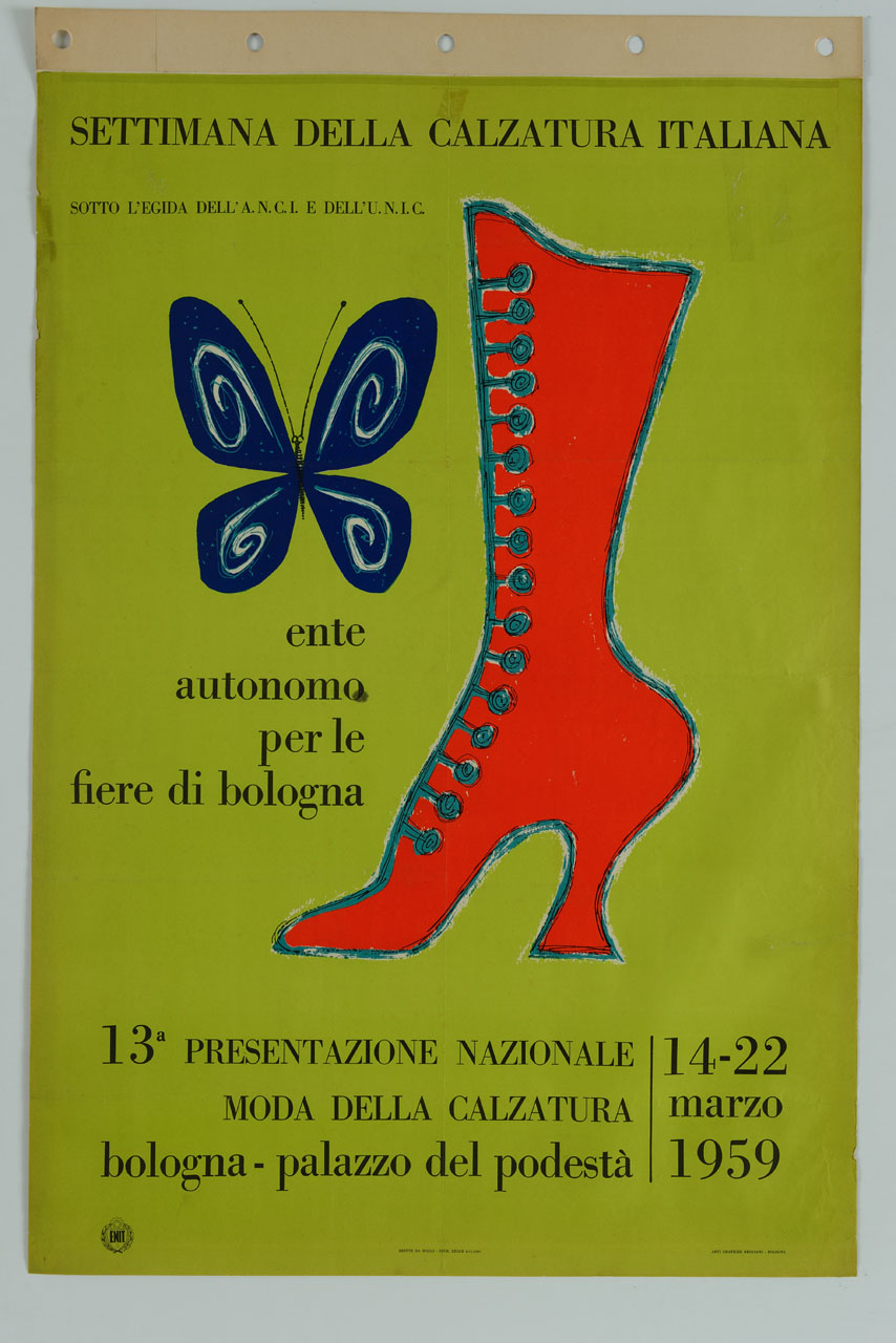 Lettura iconografica: stivale; farfalla. Categoria merceologica/ tipo evento: industria calzaturiera; moda; rassegne; associazioni economiche; associazioni sociali; enti di promozione turistica. Nomi: Settimana della calzatura italiana; 13 Presentazione nazionale moda della calzatura; Palazzo del Podestà; Ente Autonomo Fiera di Bologna; ANCI; Associazione Nazionale dei Comuni Italiani; UNIC; Unione Nazionale Industria Conciaria; ENIT; Ente Nazionale per l'incremento delle Industrie Turistiche. Luoghi: Bologna
