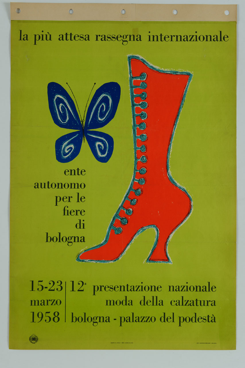 Lettura iconografica: stivale; farfalla. Categoria merceologica/ tipo evento: industria calzaturiera; moda; rassegne; associazioni economiche; enti di promozione turistica. Nomi: Ente Autonomo Fiera di Bologna; 12 Presentazione nazionale moda della calzatura; Palazzo del Podestà; ENIT; Ente Nazionale per l'incremento delle Industrie Turistiche. Luoghi: Bologna