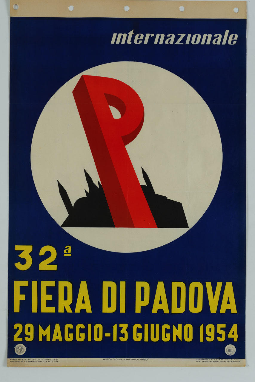 Lettura iconografica: lettera P; architetture; chiesa. Categoria merceologica/ tipo evento: commercio; industria; artigianato; agricoltura; fiere; associazioni economiche; enti di promozione turistica. Nomi: 32 Fiera di Padova Internazionale; UFI; Union des Foires Internationales; ENIT; Ente Nazionale per l'incremento delle Industrie Turistiche; Basilica di Sant'Antonio di Padova. Luoghi: Padova