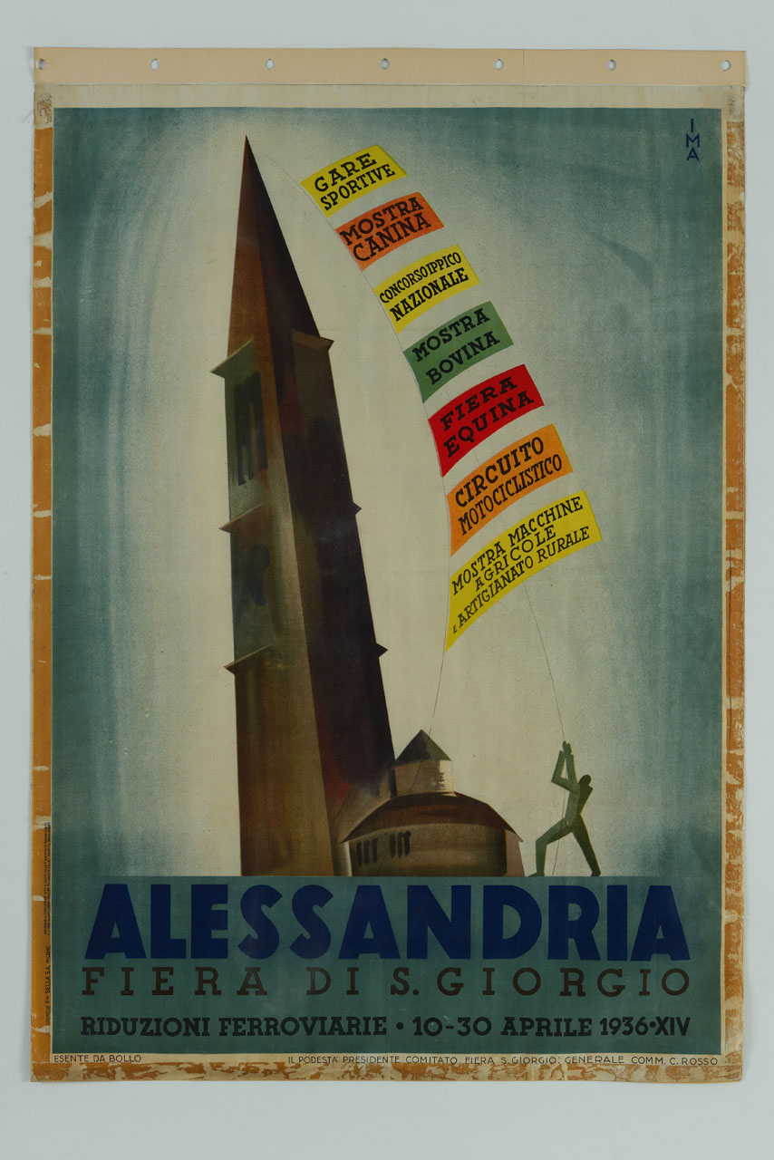 Lettura iconografica: veduta di città; architetture; cattedrale dei Santi Pietro e Marco; campanile; cupola; festone di bandierine; figura maschile; silhouette. Categoria merceologica/ tipo evento: amministrazione pubblica; enti locali; amministrazione comunale; podestà; commercio; industria; agricoltura; artigianato; allevamento; equini; bovini; fiere; animali da compagnia; cane; mostre; sport; ippica; concorsi; motociclismo; gare; riduzioni ferroviarie. Nomi: Fiera di S. Giorgio; Gare sportive; Mostra canina; Concorso ippico nazionale; Mostra bovina; Fiera equina; Circuito motociclistico; Mostra macchine agricole e artigianato rurale; Rosso C. Luoghi: Alessandria