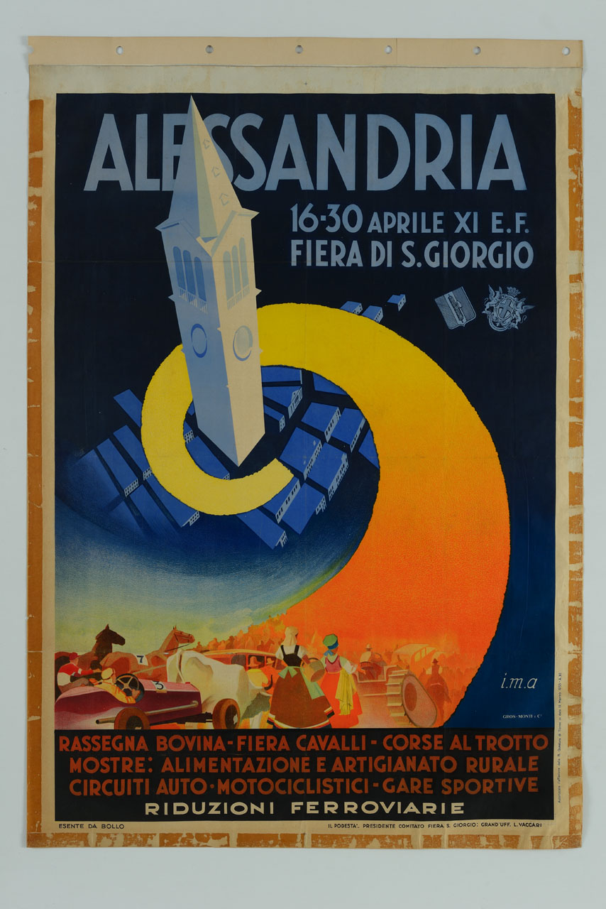 Lettura iconografica: veduta di città; architetture; cattedrale dei Santi Pietro e Marco; campanile; figure maschili; figure femminili; contadini; pilota; fantino; automobili; trattori; bue; cavalli; silhouettes; spirale. Categoria merceologica/ tipo evento: amministrazione pubblica; enti locali; amministrazione comunale; podestà; commercio; agricoltura; artigianato; allevamento; equini; bovini; fiere; mostre; sport; ippica; automobilismo; motociclismo; gare; riduzioni ferroviarie. Nomi: Fiera di S. Giorgio; Rassegna bovina; Fiera cavalli; Corse al trotto; Mostre alimentazione e artigianato rurale; Circuiti auto-motociclistici; Gare sportive; Vaccari L. Luoghi: Alessandria