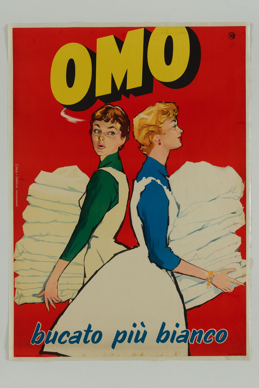 Lettura iconografica: figure femminili; grembiuli; biancheria; lenzuola; asciugamani. Categoria merceologica/ tipo evento: industria chimica; saponi e detergenti; detersivo per bucato. Nomi: Omo; Unilever. Luoghi: Italia