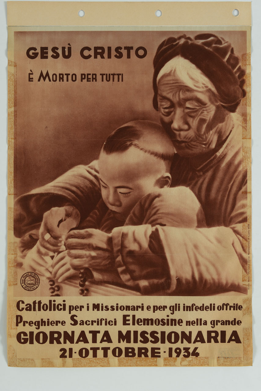 Gesù Cristo è morto per tutti. Giornata Missionaria 21 ottobre 1934. anziana donna orientale e bambino pregano con corona del rosario