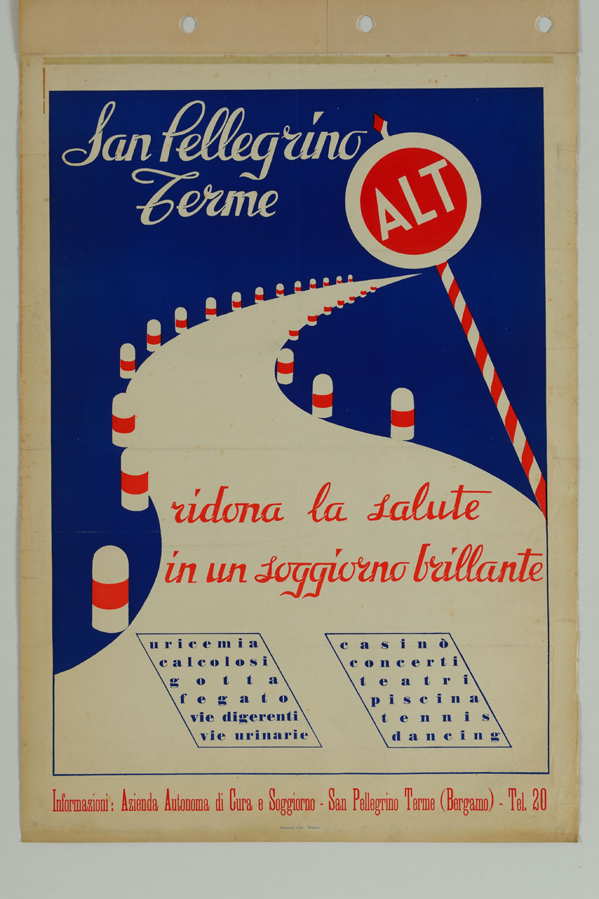 Lettura iconografica: strada; cartello stradale. Categoria merceologica/ tipo evento: turismo; terme; strutture di cura; tempo libero; casinò; sala da ballo; spettacolo; teatro; musica; concerto; sport; impianti sportivi piscina; campo da tennis; enti di promozione turistica. Nomi: San Pellegrino Terme; Azienda Autonoma di Cura e Soggiorno. Luoghi: Bergamo; San Pellegrino Terme