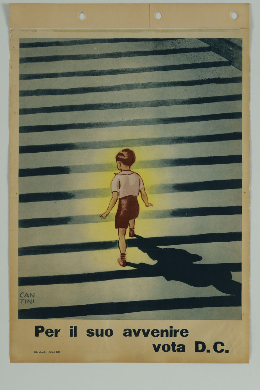 Lettura iconografica: bambino; scalinata. Categoria merceologica/ tipo evento: informazione e comunicazione; propaganda politica; propaganda elettorale; politica; partiti politici. Nomi: DC; Democrazia Cristiana