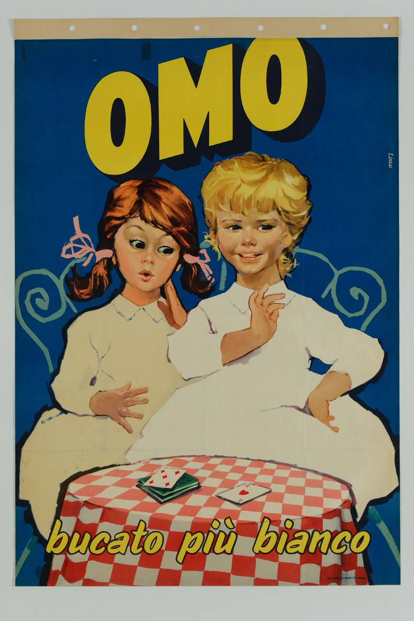 Lettura iconografica: bambine; tavolino; sedie in ferro; carte da gioco; asso di cuori. Categoria merceologica/ tipo evento: industria chimica; saponi e detergenti; detersivo per bucato. Nomi: Omo; Unilever; Fratelli Lever; Lever Gibbs. Luoghi: Regno Unito: Londra; Paesi Bassi; Rotterdam; Milano