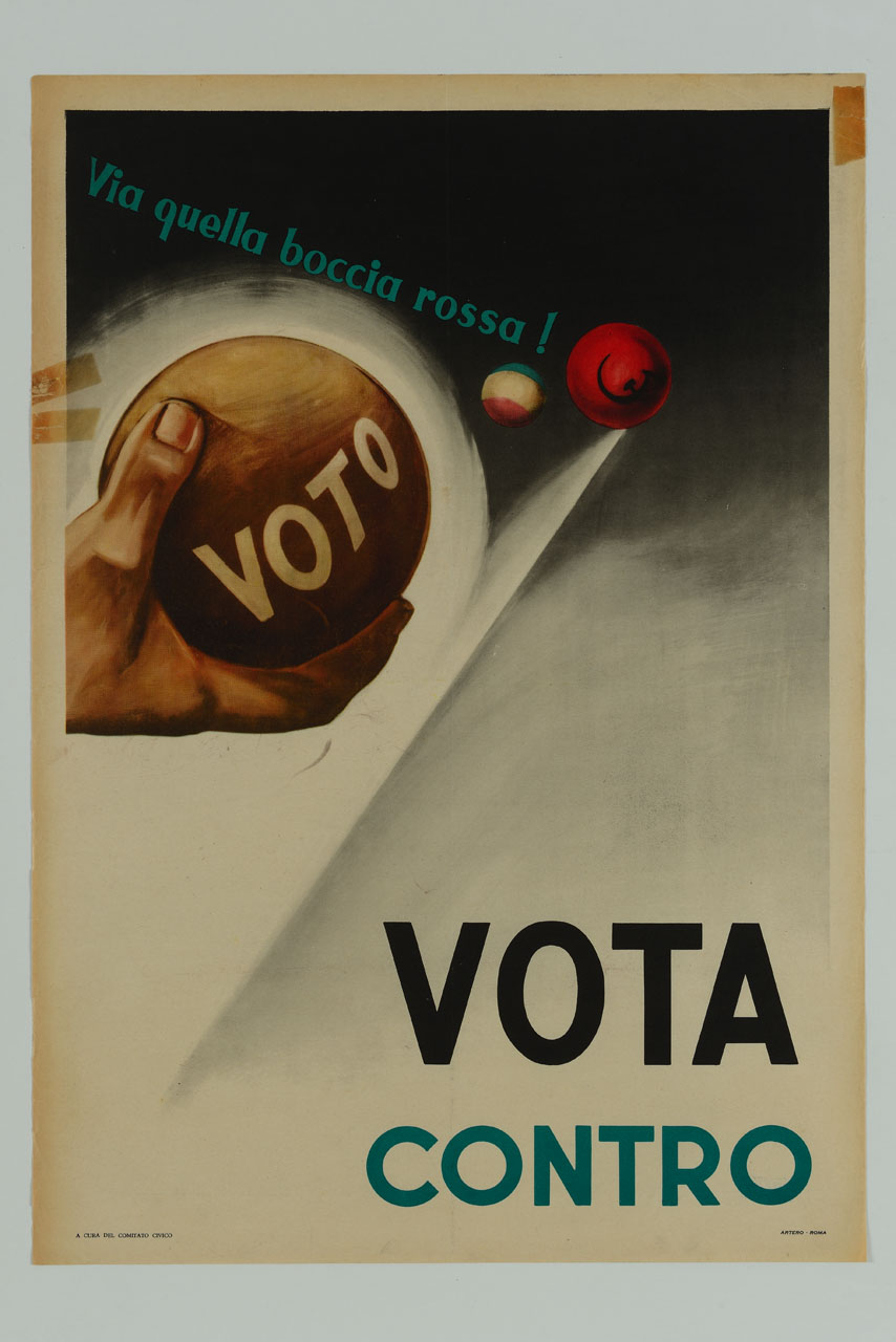Lettura iconografica: mano; boccia; boccino; tricolore verde, bianco e rosso. Categoria merceologica/ tipo evento: informazione e comunicazione; propaganda elettorale; propaganda anticomunista; politica